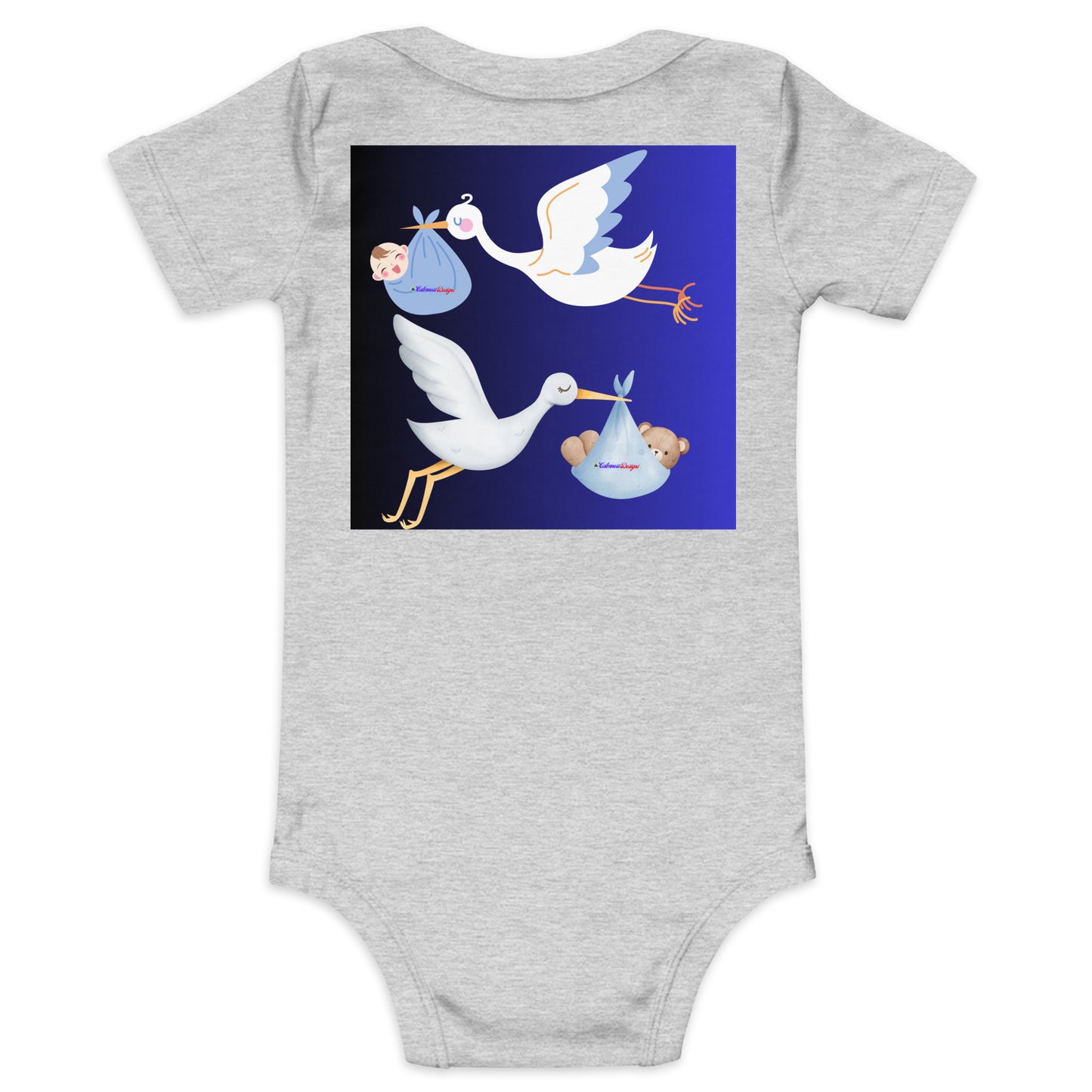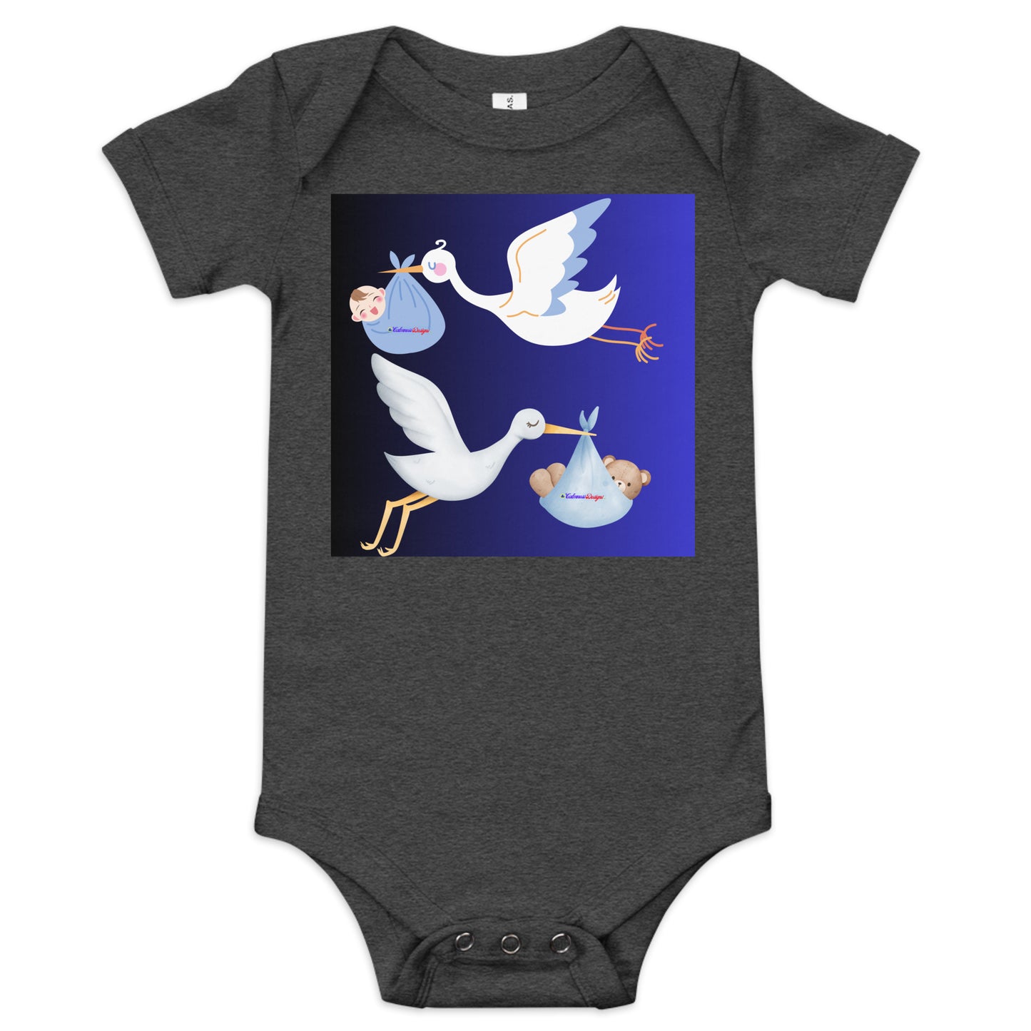 Cute Cartoon Stork with Baby Teddy Bear, Baby Boy Cartoon, CALMNESS DESIGNS, Creative Designer's, Baby short sleeve one piece